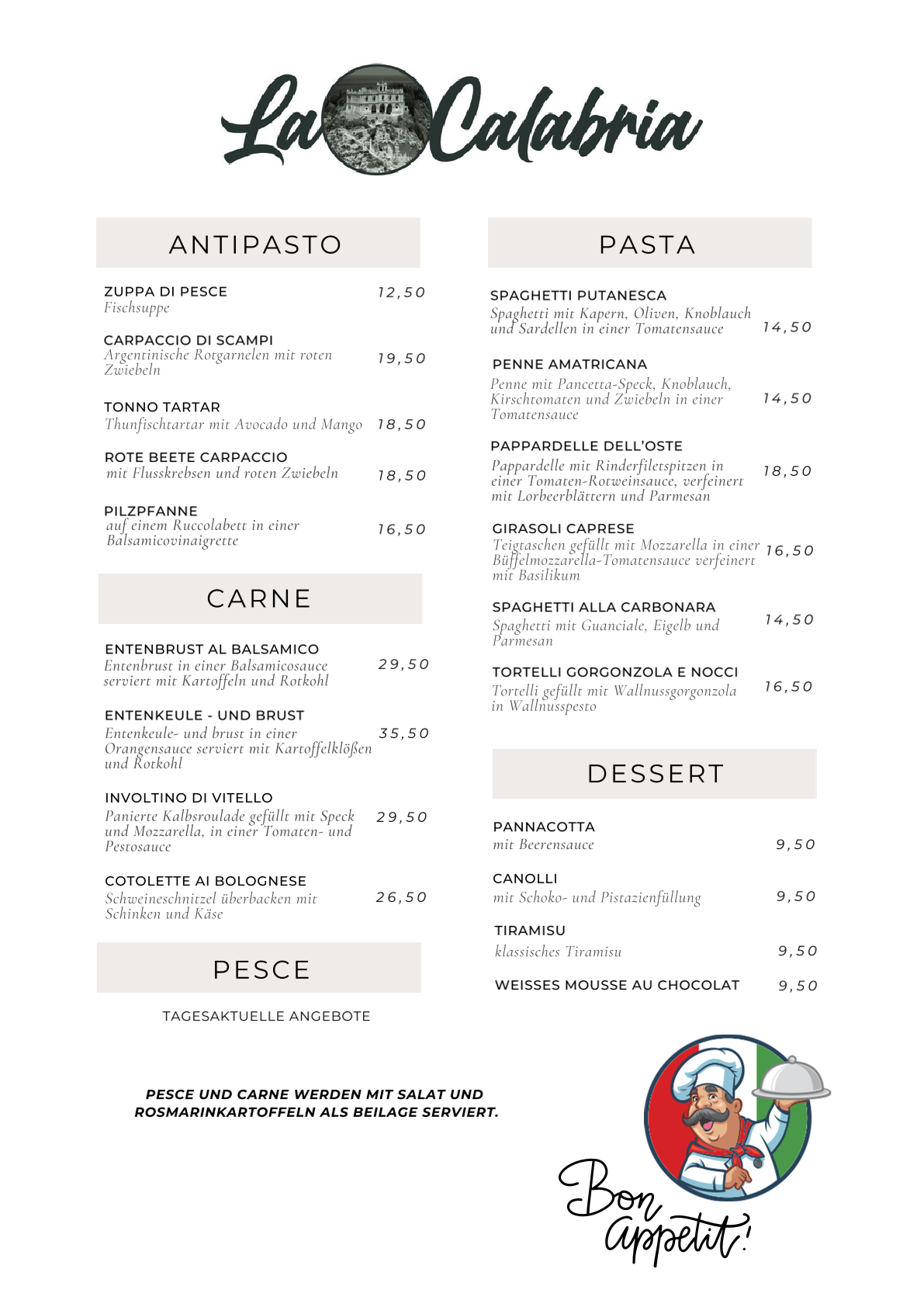 Kosten Sie zum Beispiel Scaloppina tutti Gusti, zarte Schweinemedaillons mit Sauce nach Wahl, oder Saltimbocca alla Romana, Kalbsmedaillons mit Parmaschinken in Salbeisauce.